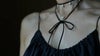 パールの数を少し減らし、シルクリボンに、そしてお首とのバランスを整えやすいように、リボンを長くすることで胸上でクロスしてバランス調整が実現。