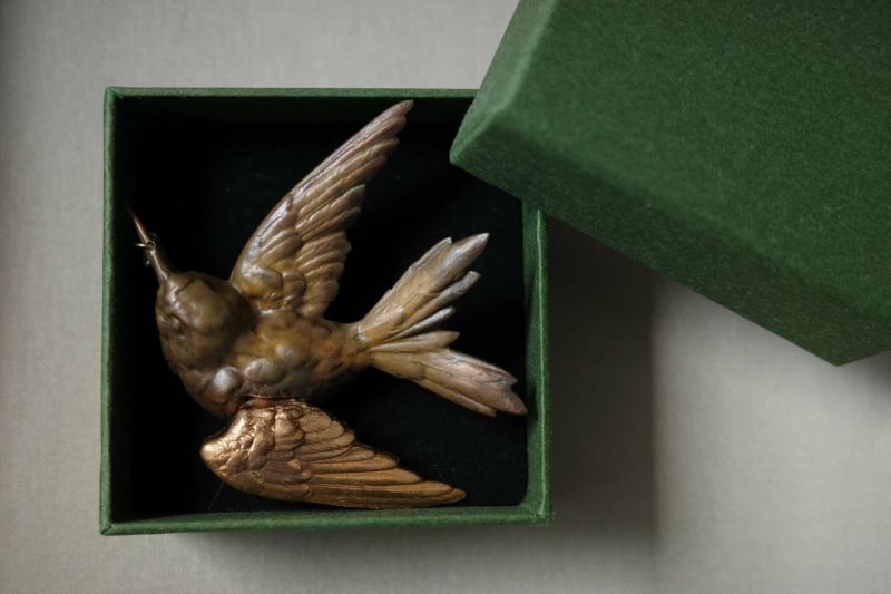 A crystal is delicately hidden in its beak.