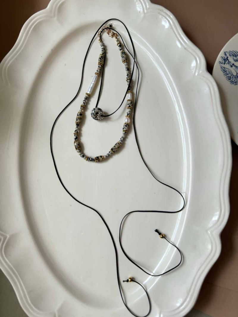 ビーズネックレスとsilkリボンのチョーカーを一緒につけたり、別々につけたり、お手持ちのネックレスと重ね付けなど色々お楽しみください。